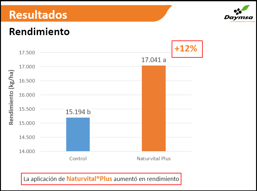 En cuanto al rendimiento, la aplicación de Naturvital®Plus incrementó la producción total hasta los 17.041 kg/ha (+12% respecto al control,15.194 Kg/ha).
