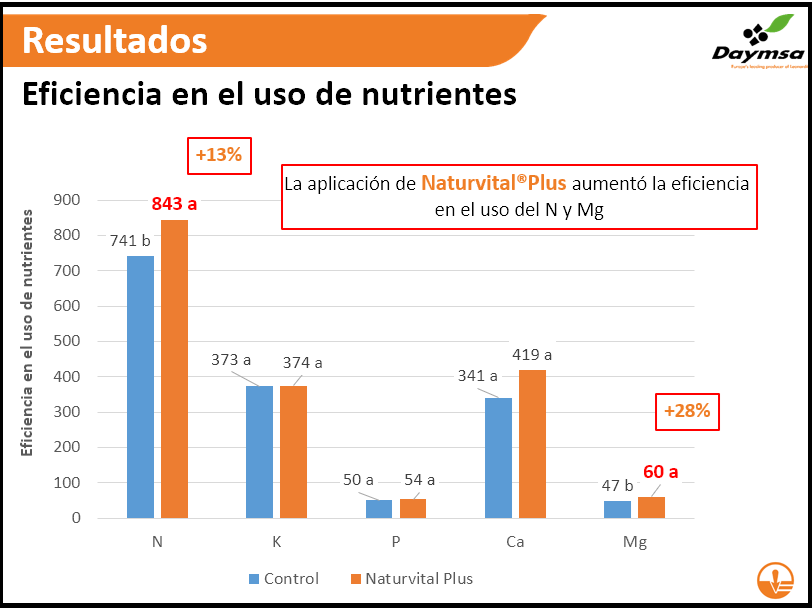 Y en eficiencia en el uso de nutrientes, se observó un aumento significativo en la eficiencia de uso del nitrógeno (N) y magnesio (Mg), con mejoras del +13% y +28%, respectivamente.